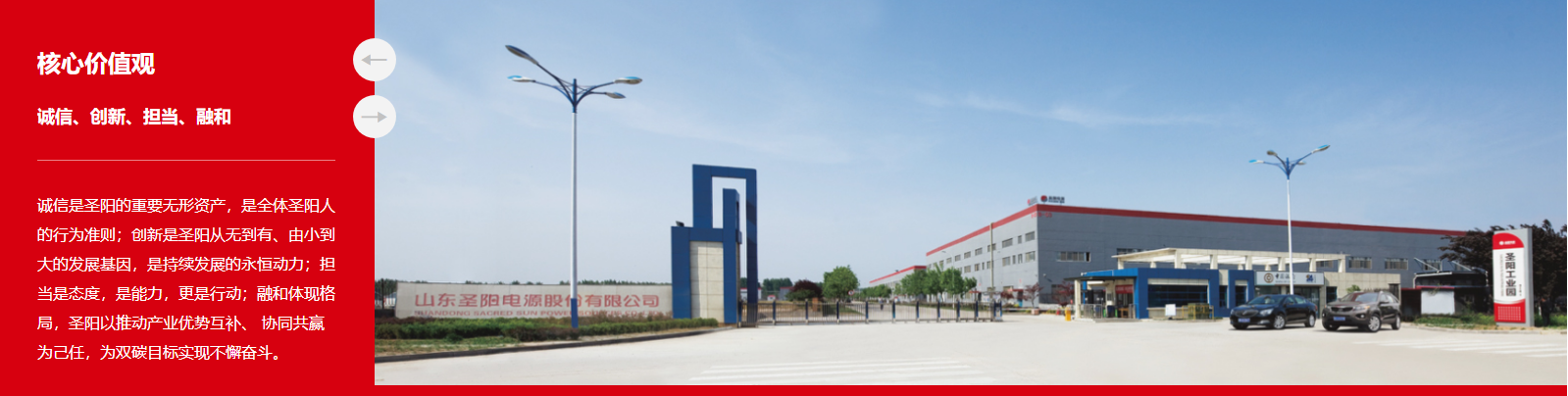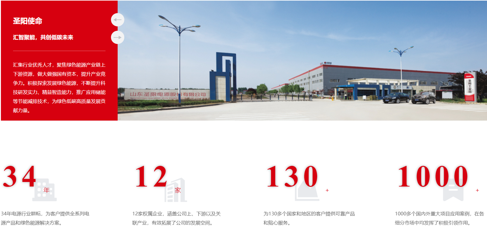 关于圣阳 ABOUT US 公司(股票代码002580)创建于1991年,2011年在深交所上市,现为山东发展投资控股集团有限公司旗下企业。公司是国家高新技术企业、国家科改企业,拥有国家认定企业技术中心,主导、参与制定国家、行业标准100余项。公司主要从事储能电池及系统的设计、研发、制造和销售,致力于为全球通信、数据/算力中心、储能及电力领域客户提供电池产品、储能系统和一体化智能电源解决方案,是国际知名、国内领先的绿色能源解决方案供应商。